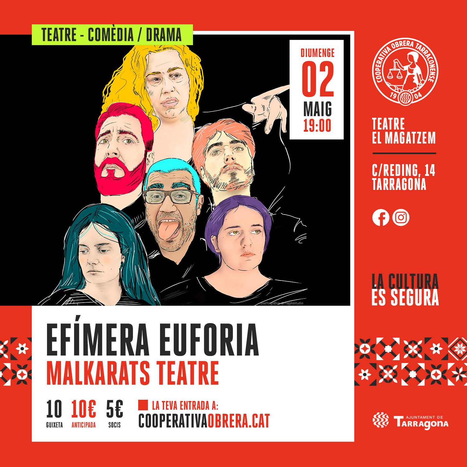 El 2 MAIG tindrem a quatre personatges en quatre situacions diferents que ens mostren les seves pors, els seus desitjos, les seves alegries i les seves tristeses. Efímera Eufòria és comèdia, drama, reflexió, un joc, un ball que alterna el pausat amb el frenètic. Un “subidón”. Una muntanya russa d’emocions que no deixa indiferent.